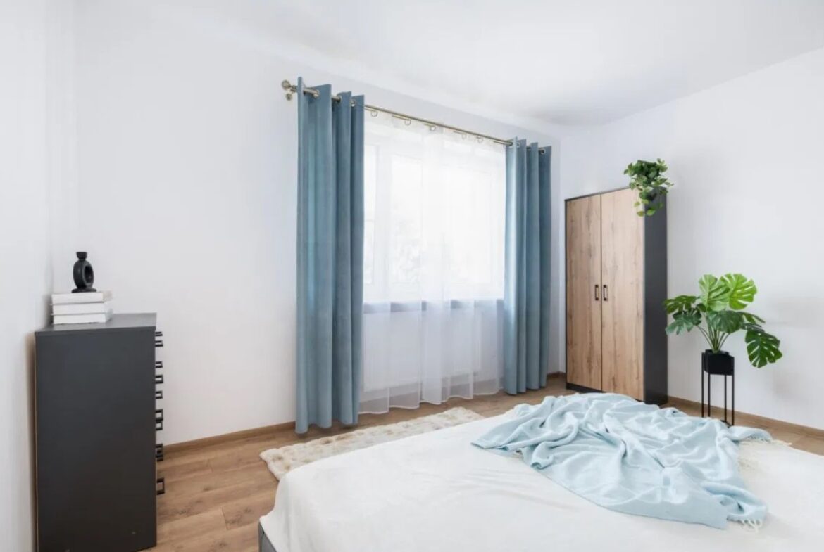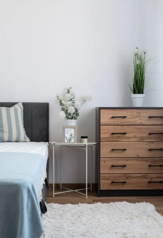 – sypialni z łóżkiem, komodą i szafą,