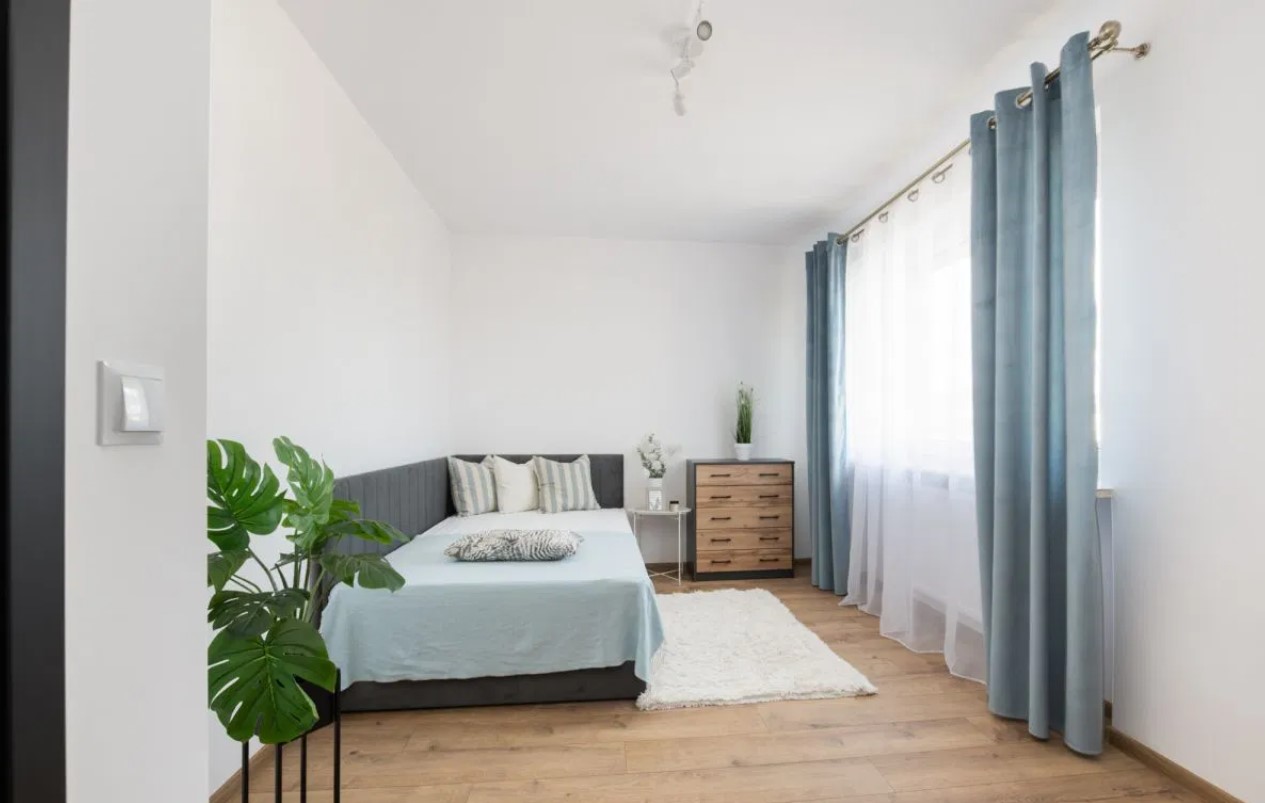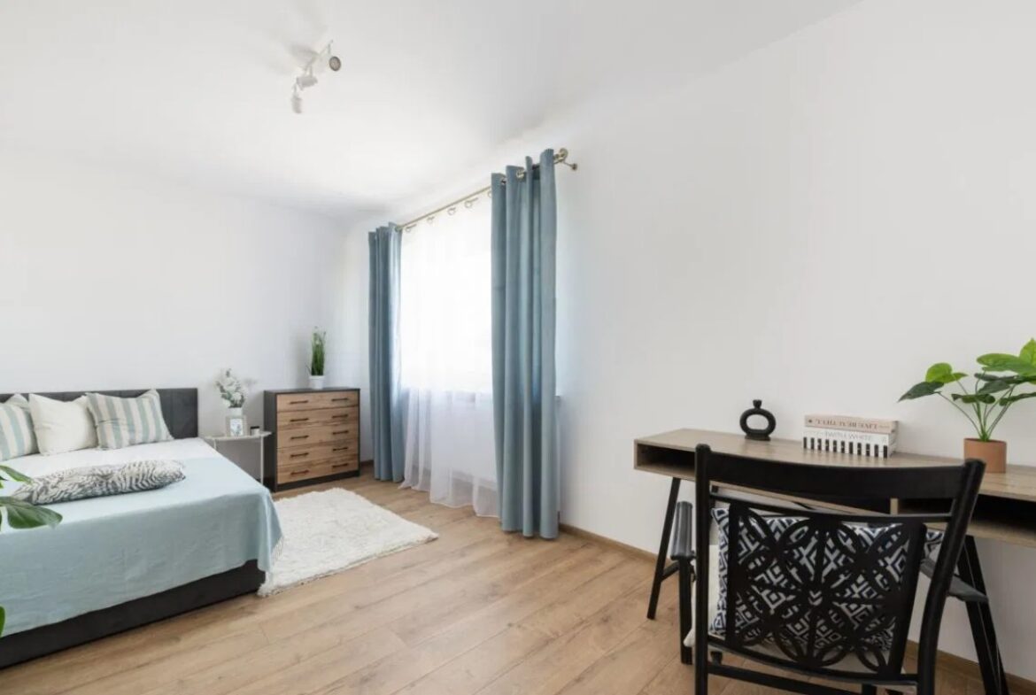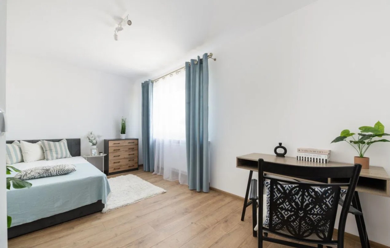 – sypialni z łóżkiem, biurkiem oraz komodą,