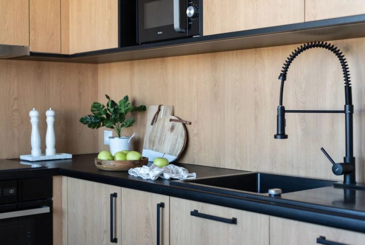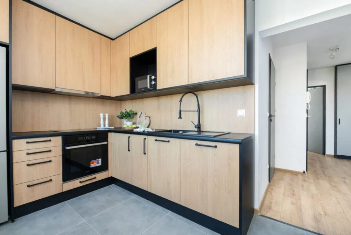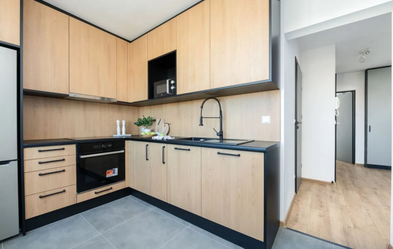 -osobnej kuchni z nowymi meblami i sprzętami AGD,