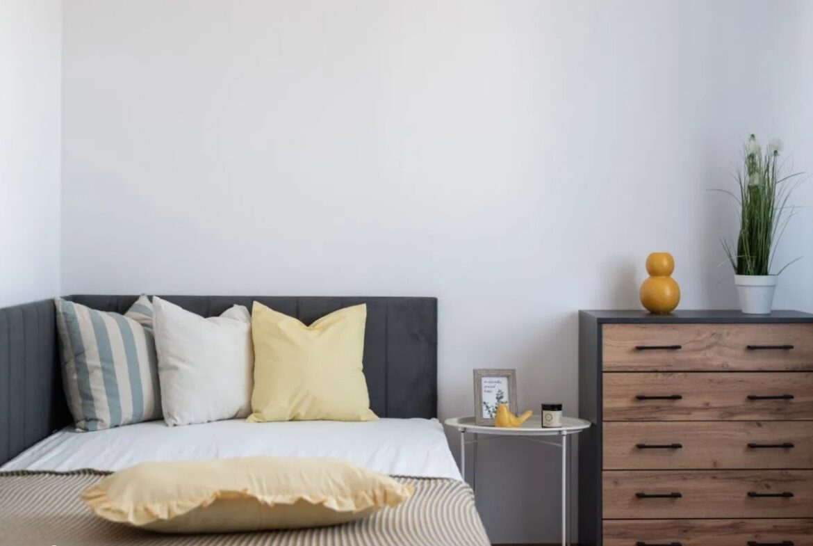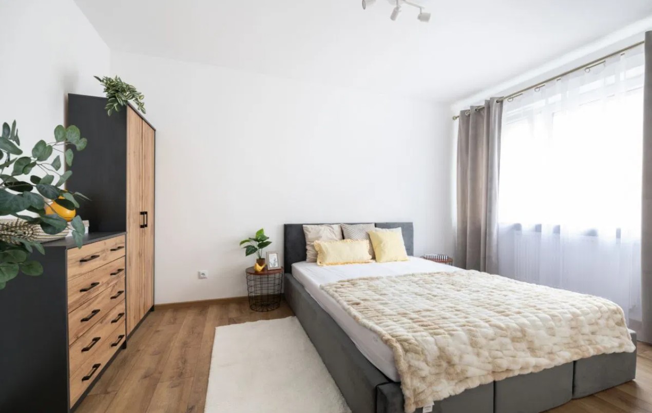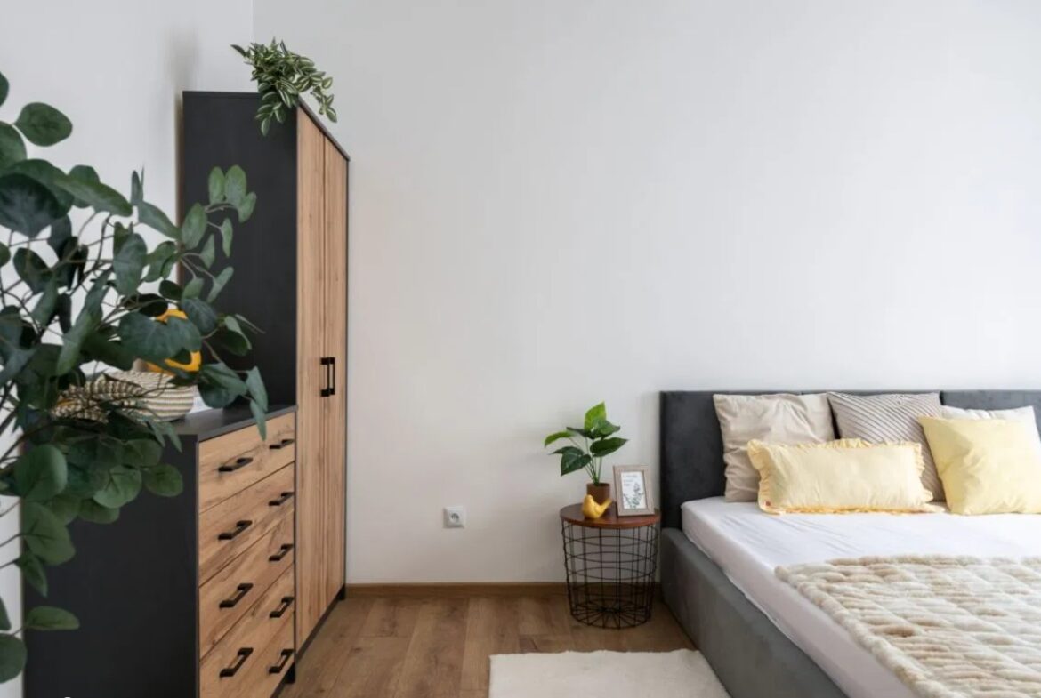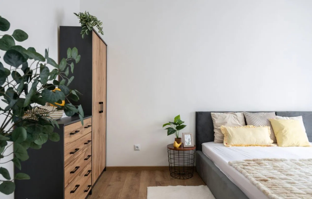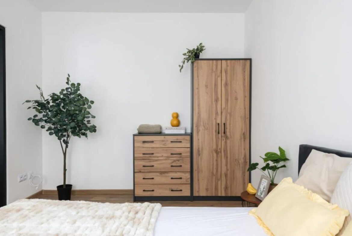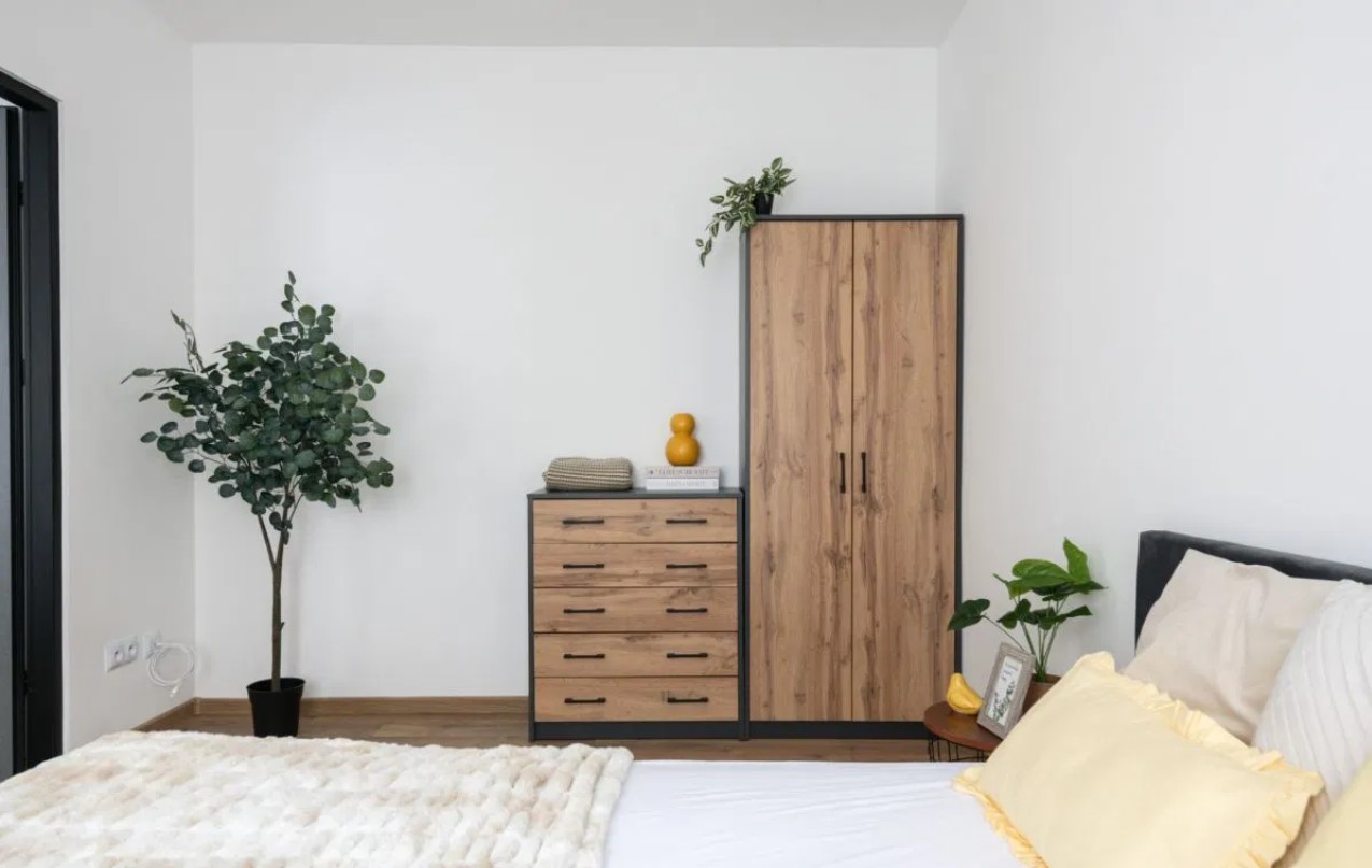 – sypialni z łóżkiem, komodą i szafą,