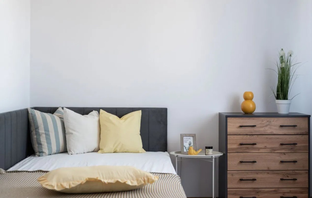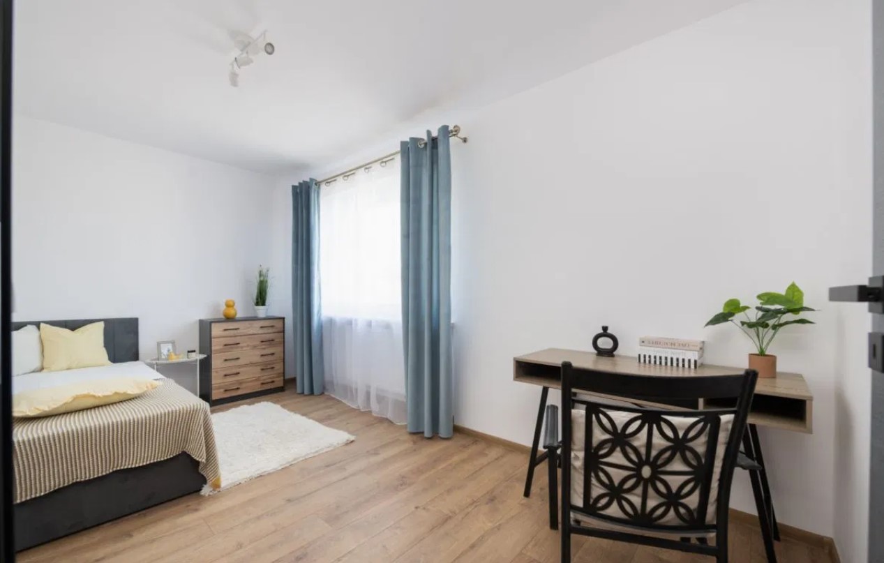 – sypialni z łóżkiem, biurkiem oraz komodą,