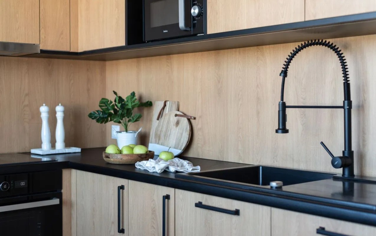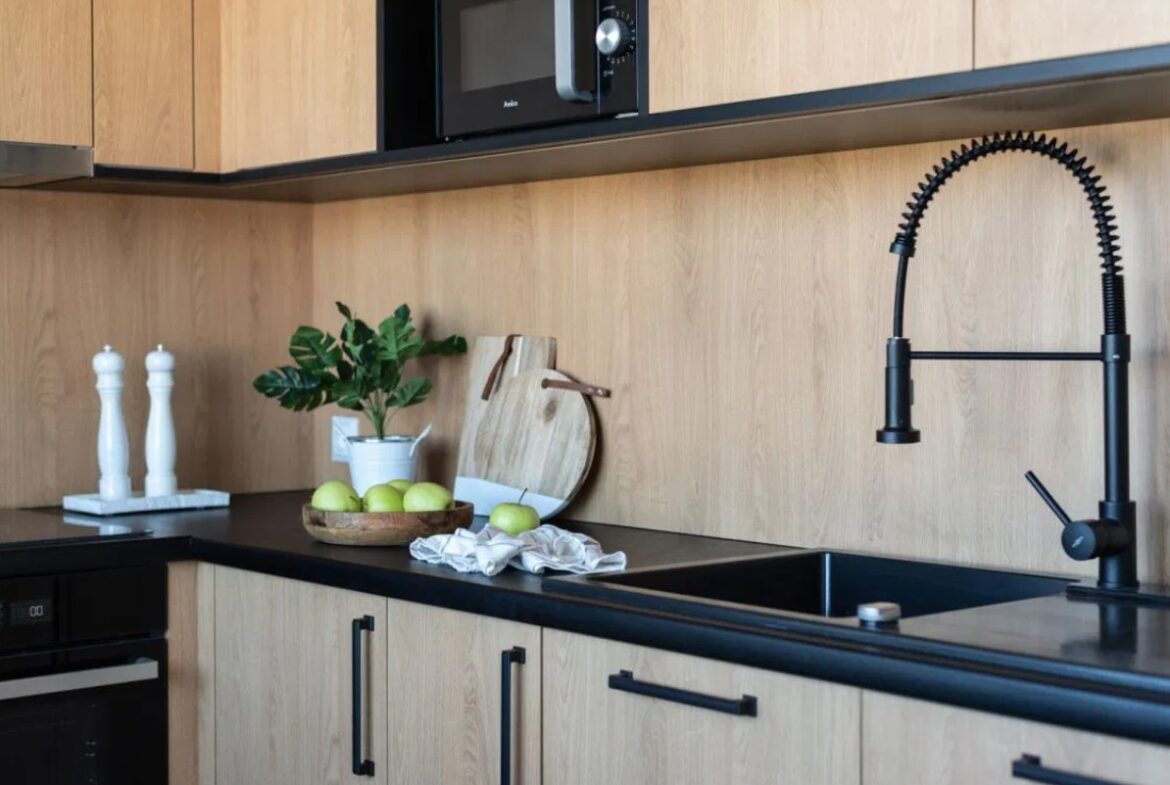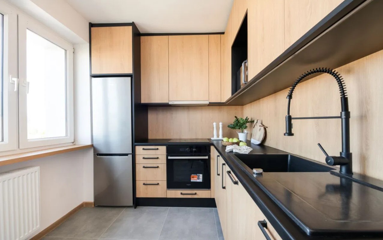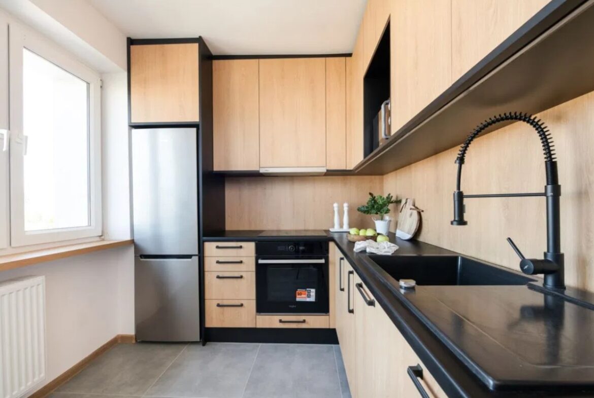 -osobnej kuchni z nowymi meblami i sprzętami AGD,
